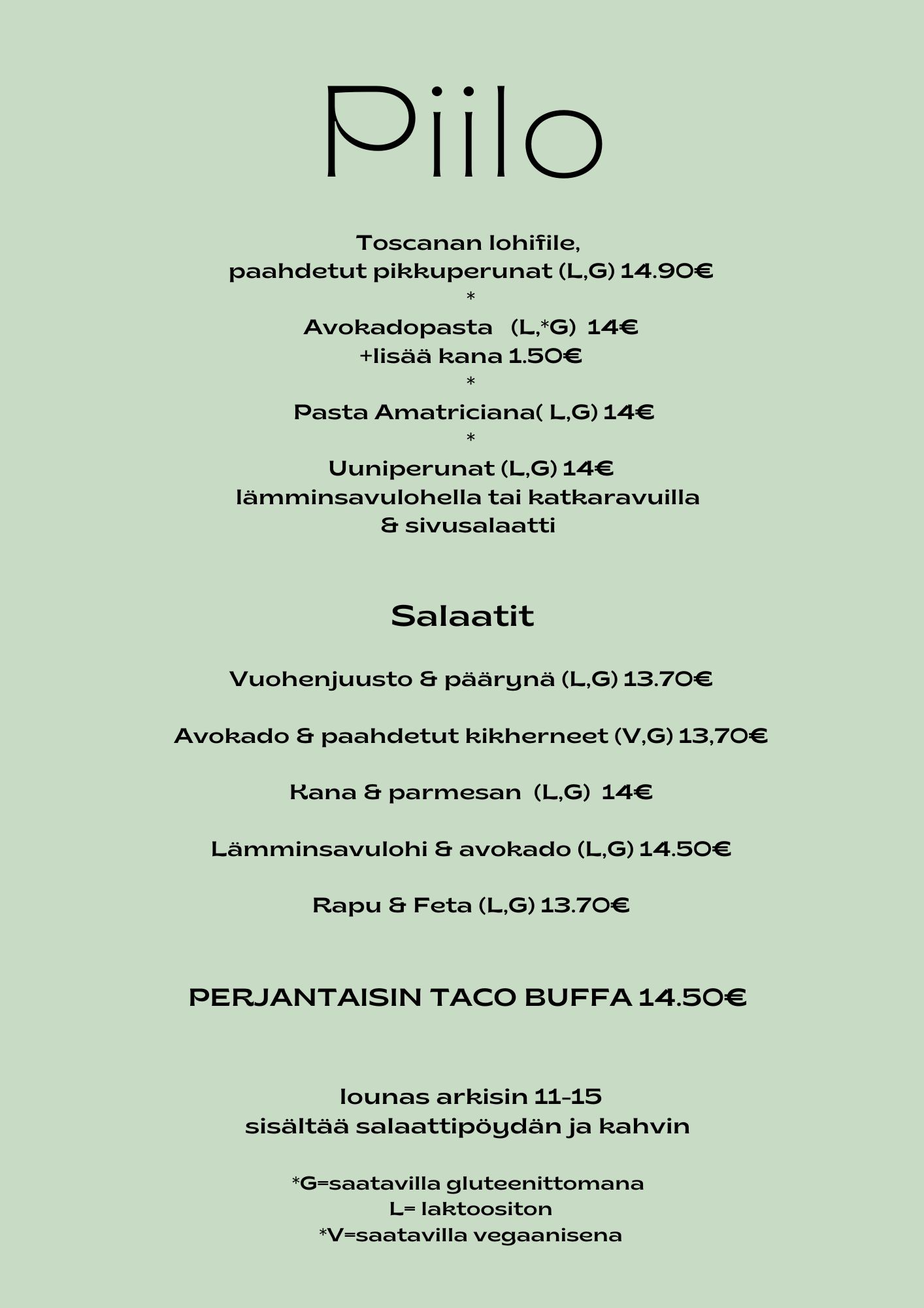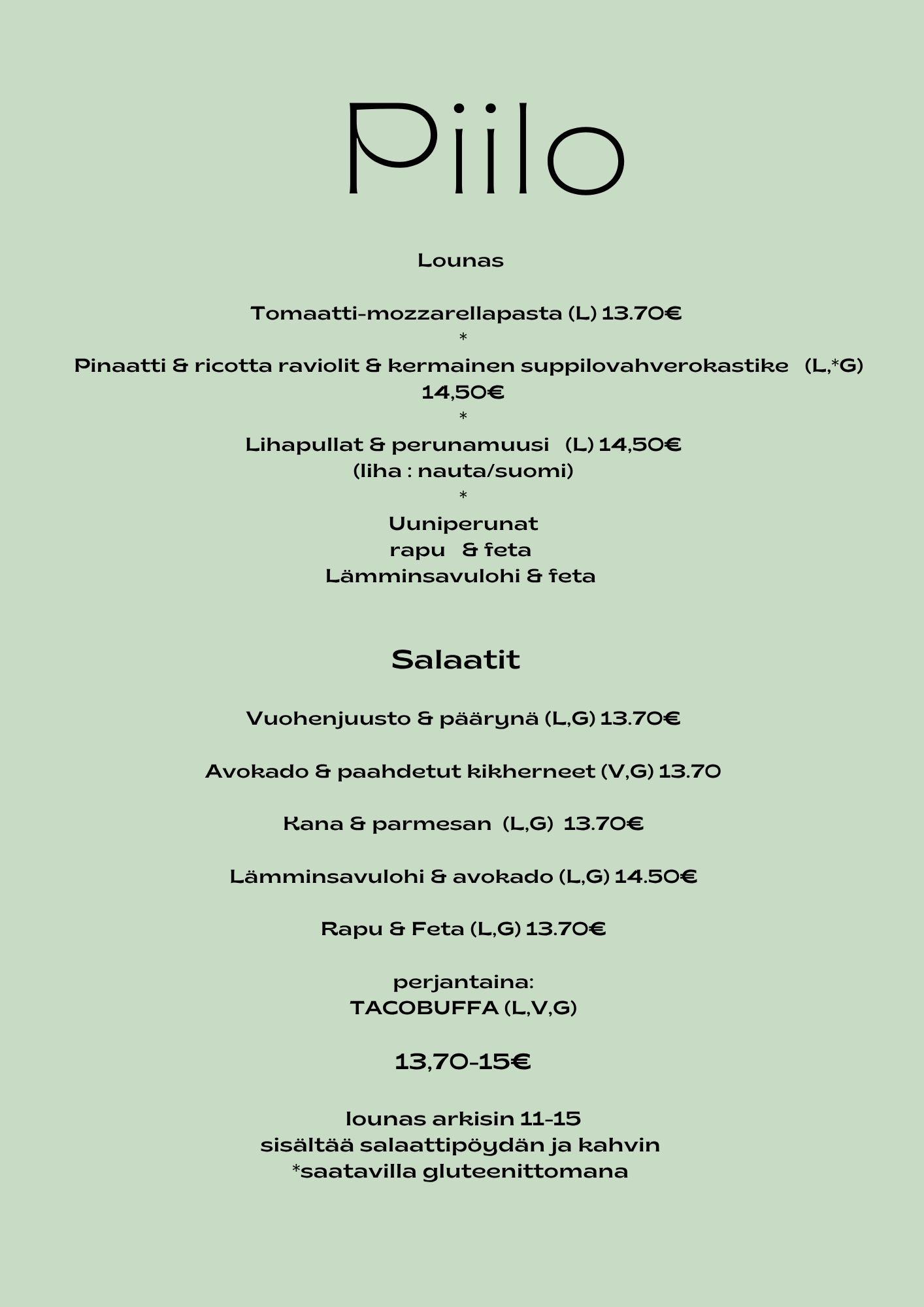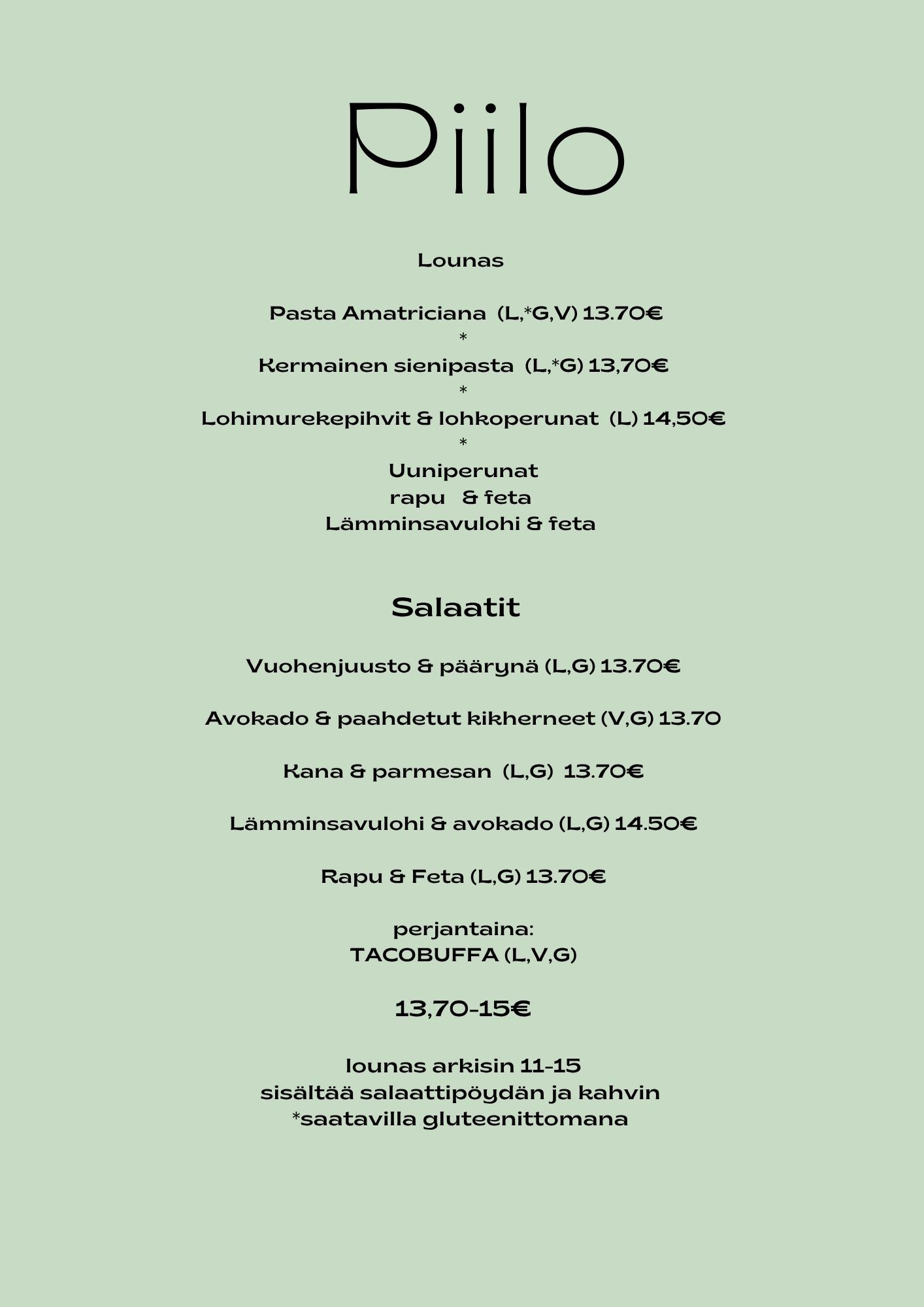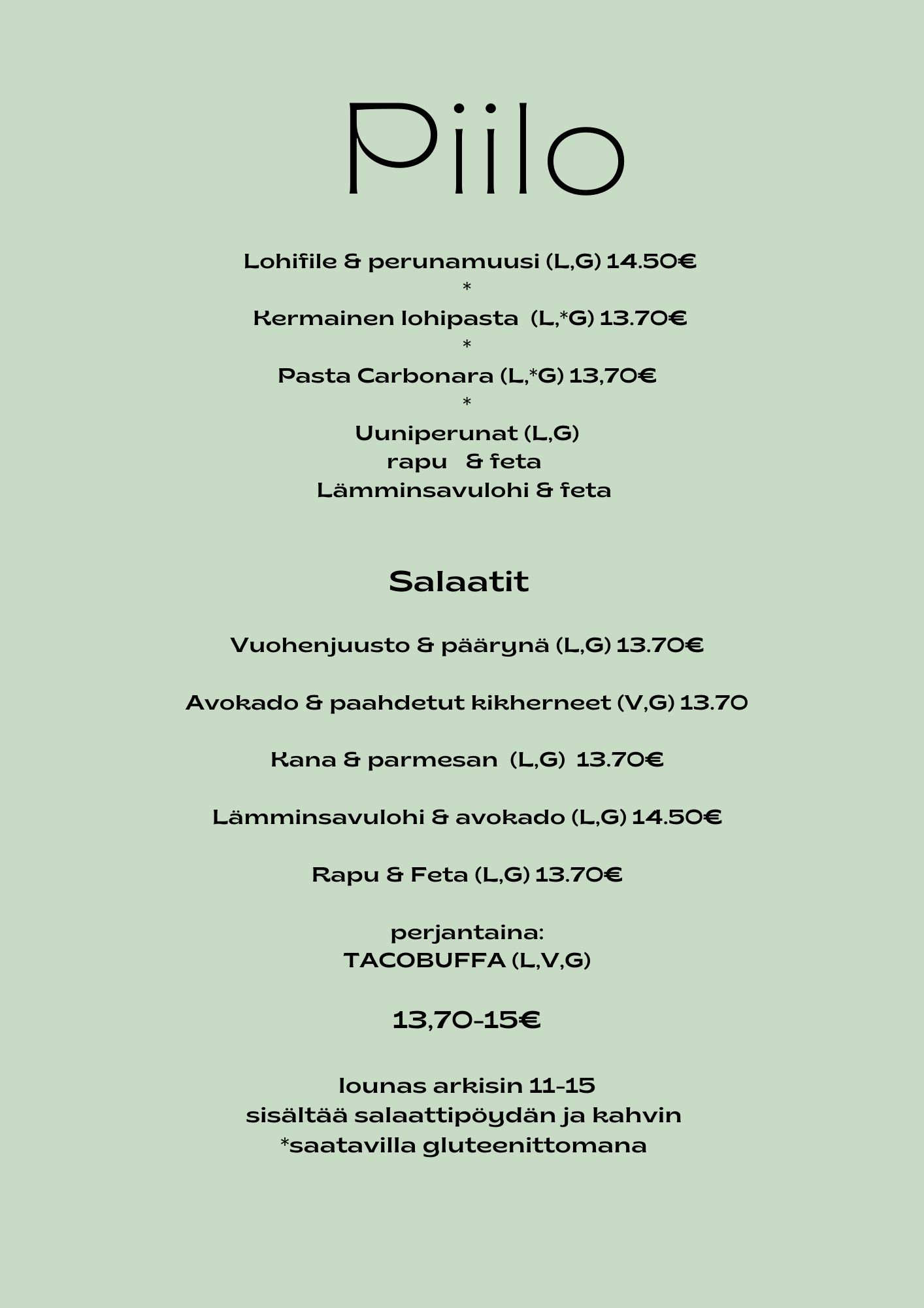 Ilmoitathan mahdolliset allergiat etukäteen puhelimella tai sähköpostiin contact@ravintolapiilo.com.