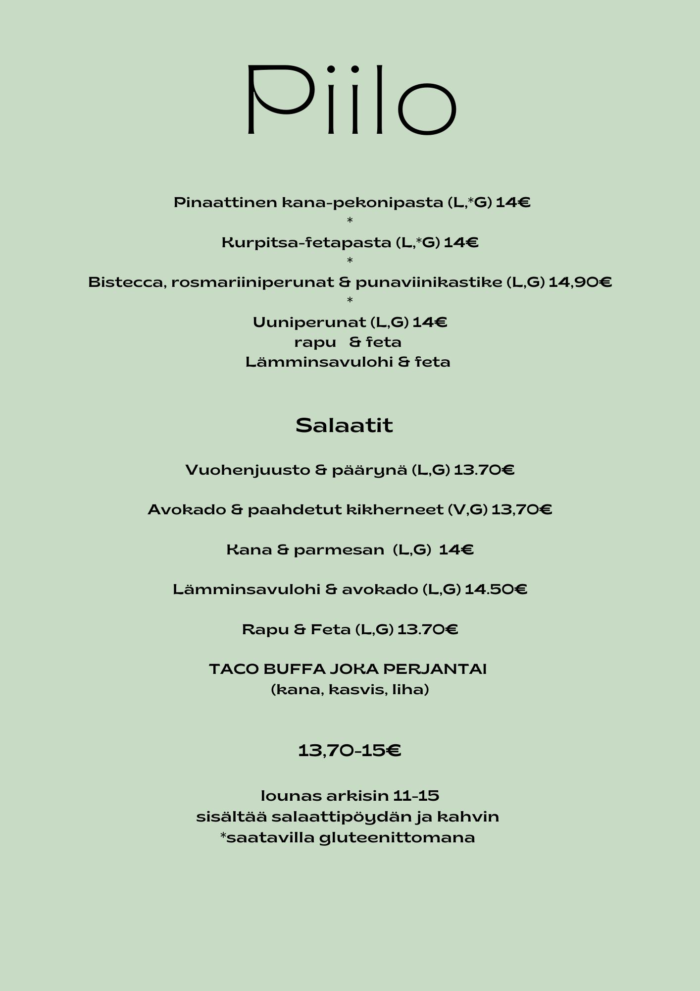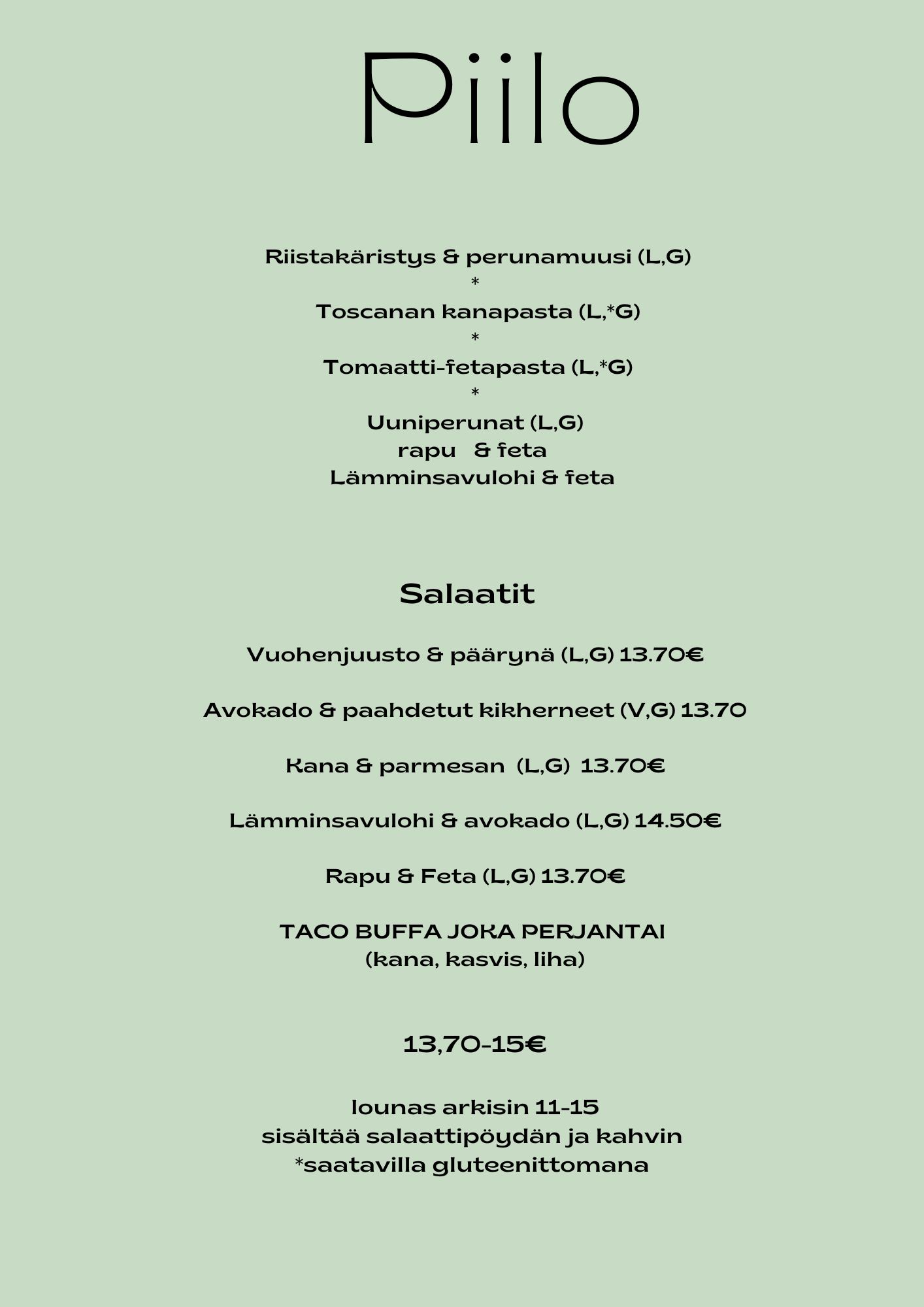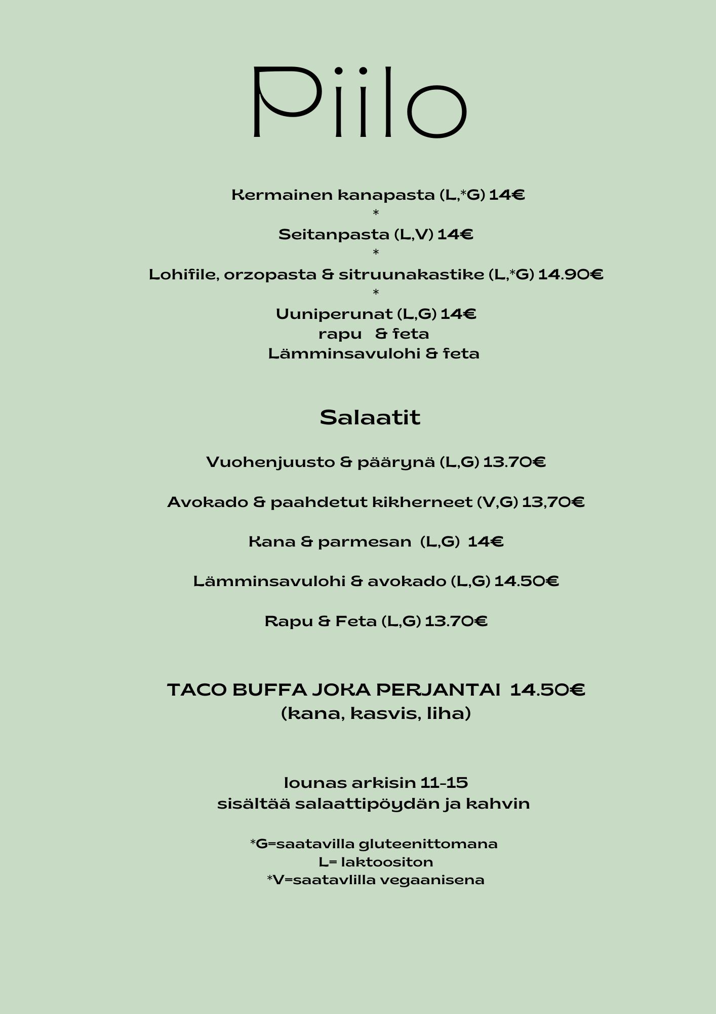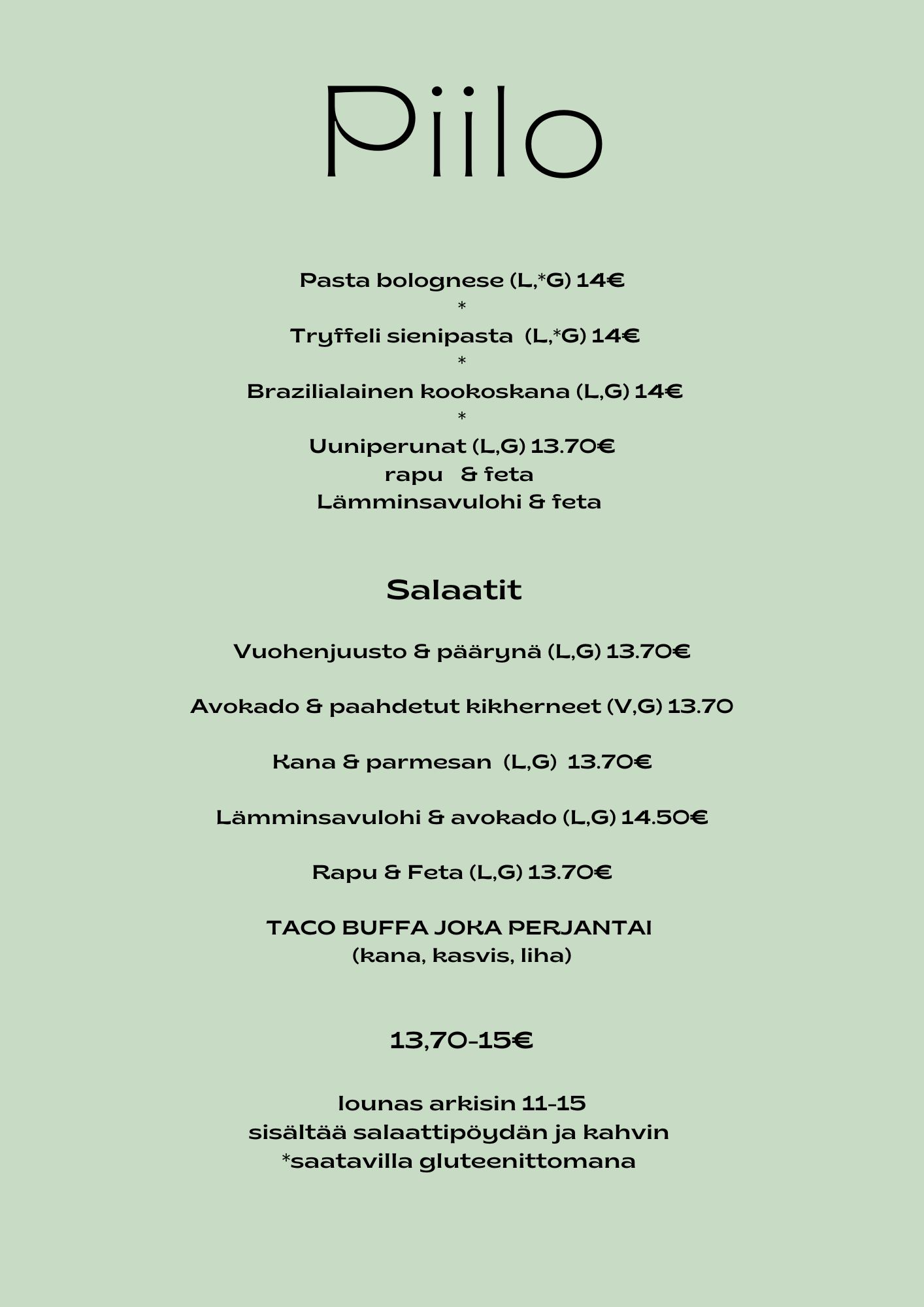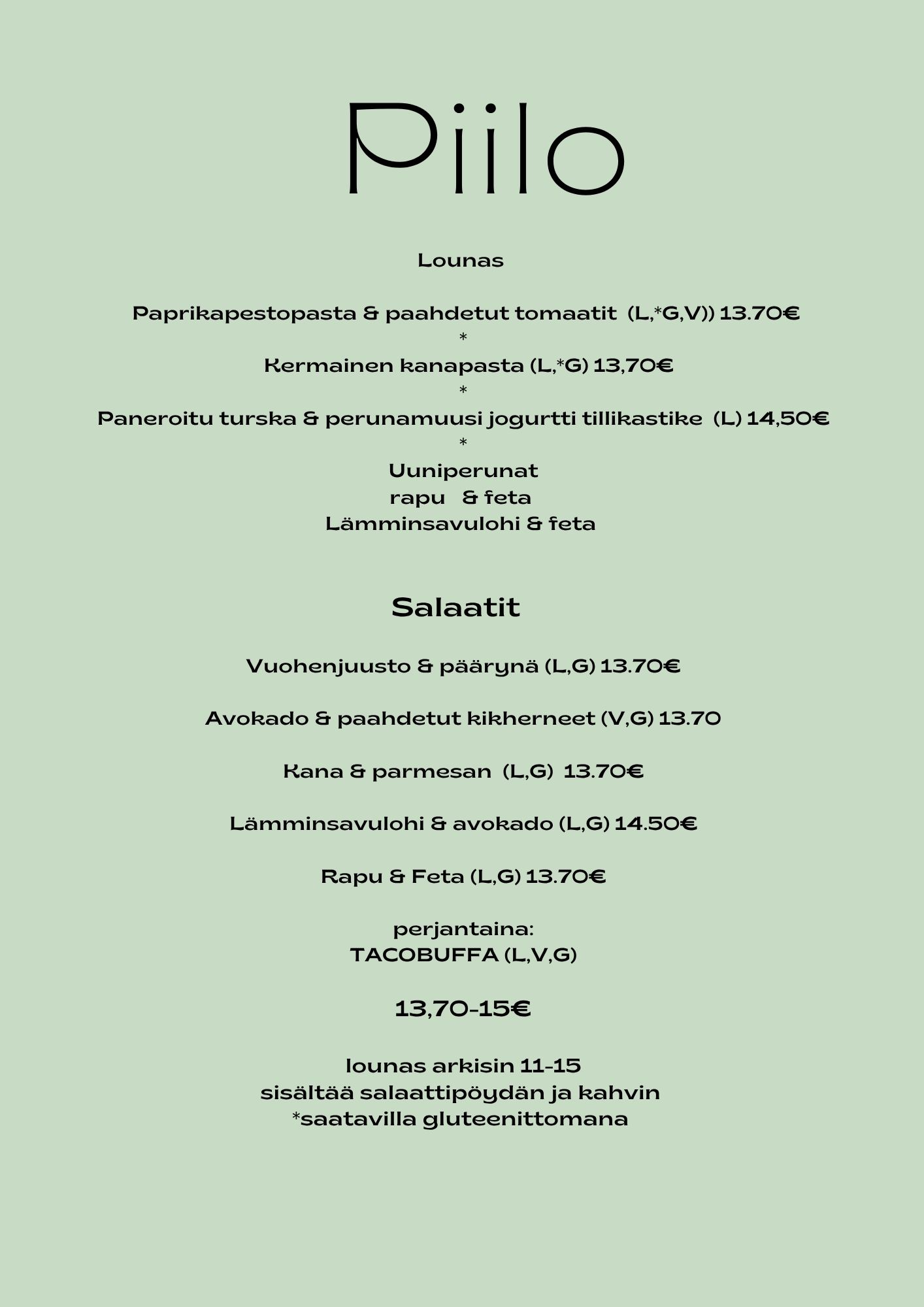 Ilmoitathan mahdolliset allergiat etukäteen puhelimella tai sähköpostiin contact@ravintolapiilo.com.