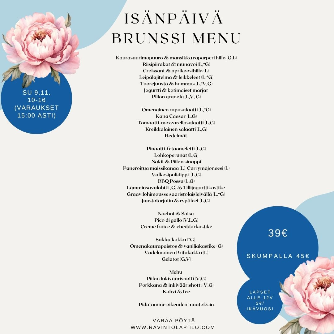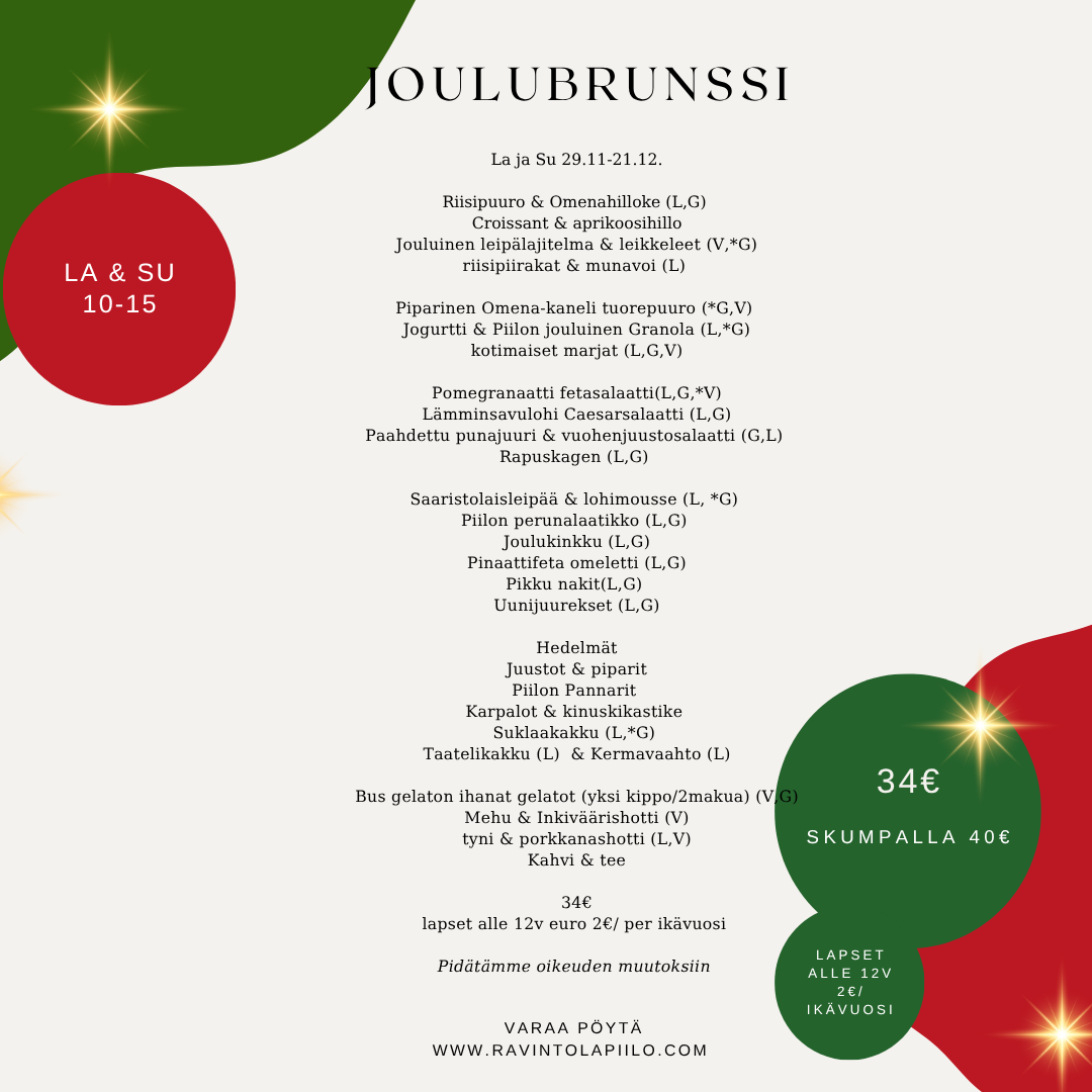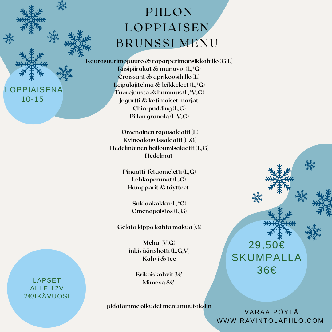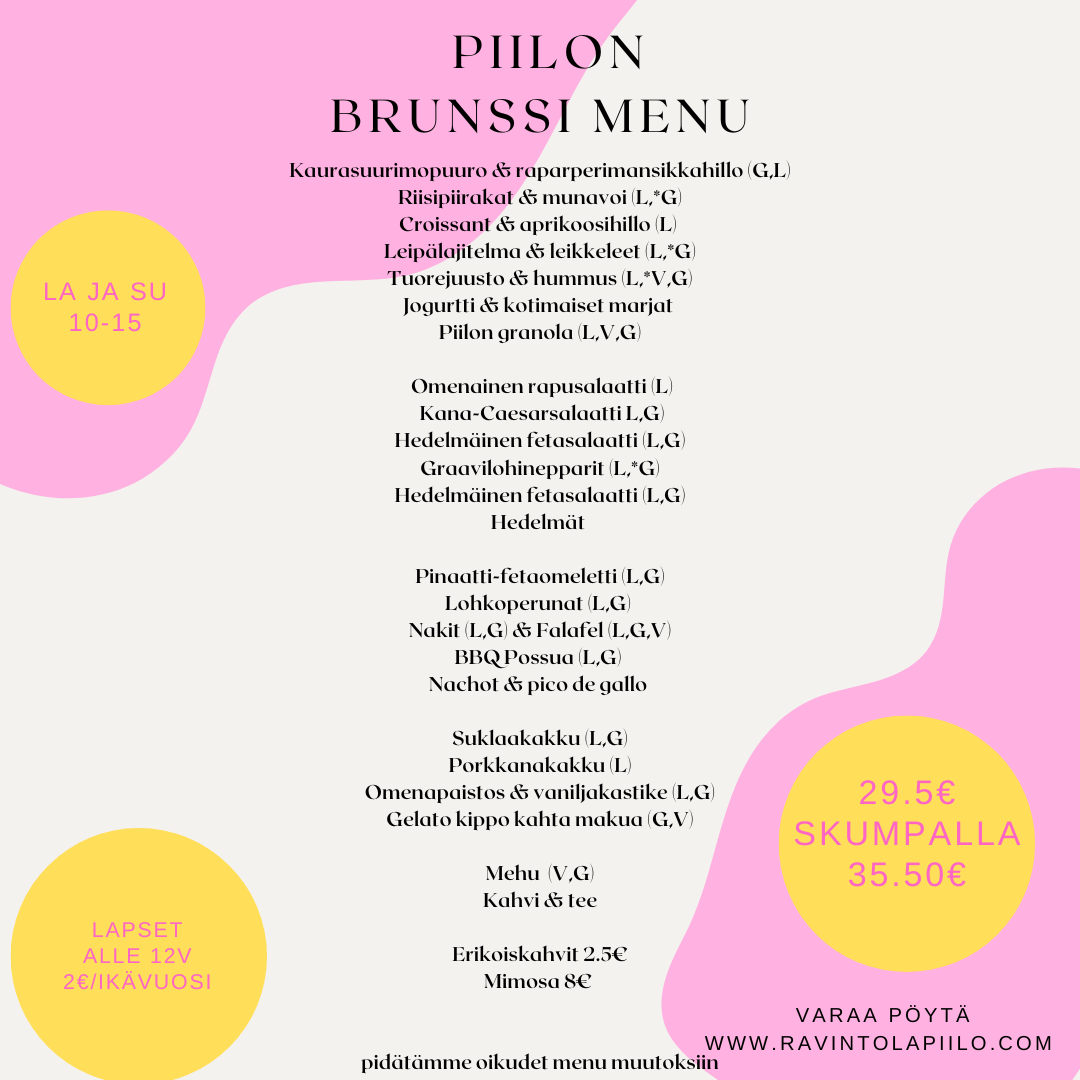 Ilmoitathan mahdolliset allergiat etukäteen puhelimella tai sähköpostiin contact@ravintolapiilo.com.